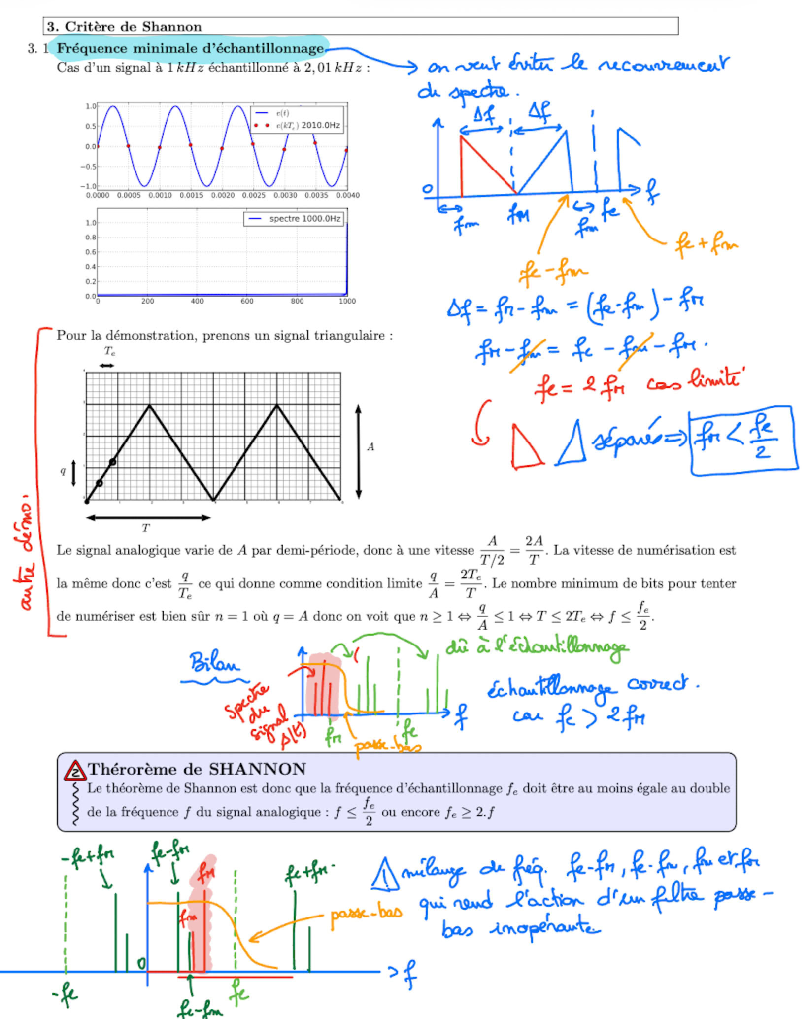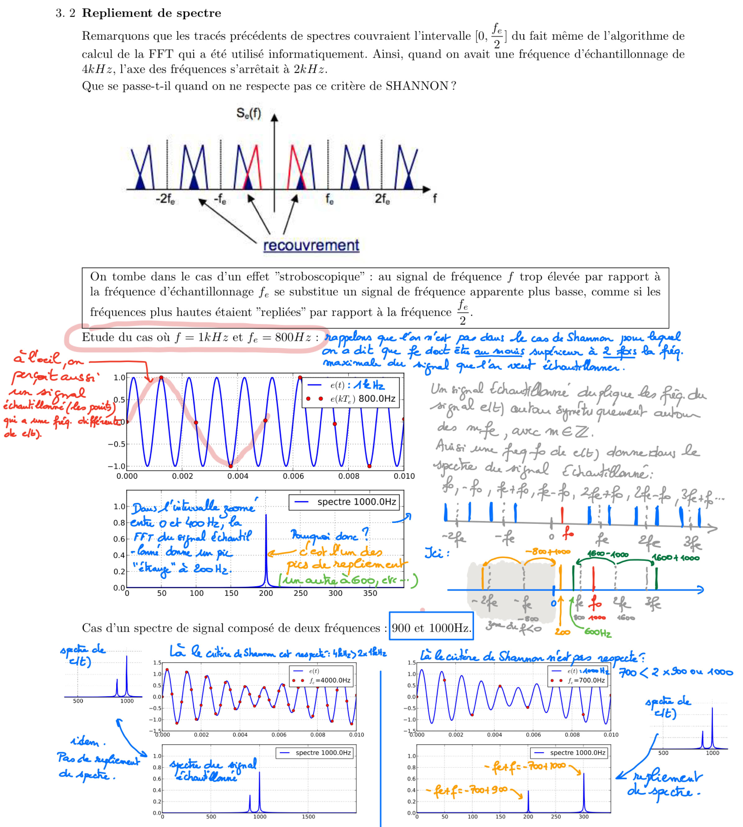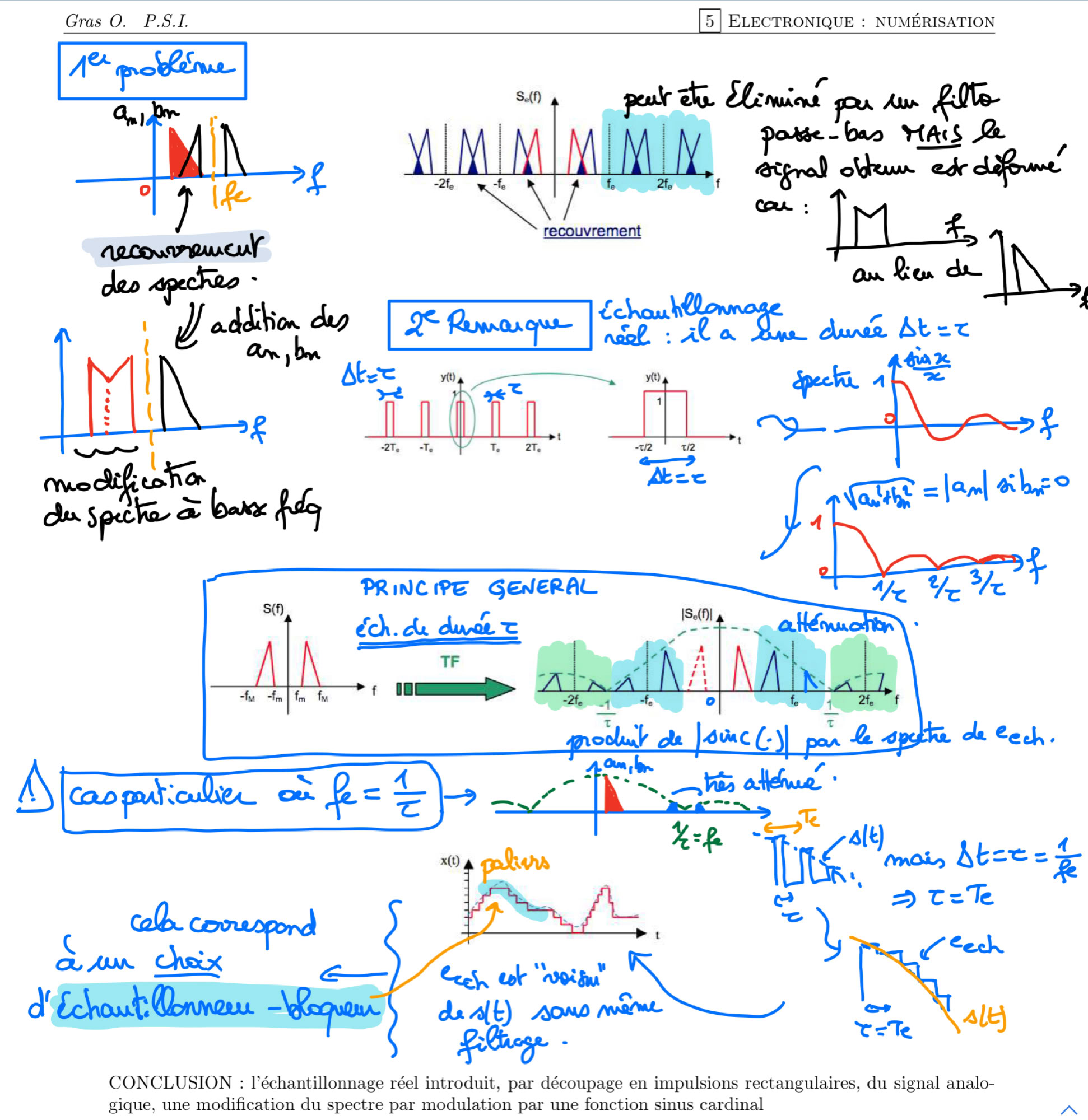 En résumé, pour un échantillonnage à la fréquence Fe, l’acquisition dédouble le spectre autour des fréquences de valeurs m.Fe , avec m entier relatif. Mais la « largeur » des pics d’échantillonnage implique une modulation (« atténuation ») en valeur absolue de sinus cardinal.