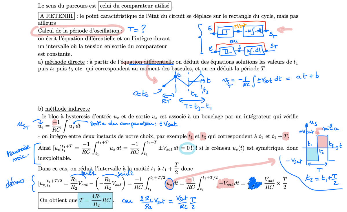 - Oscillateurs à relaxation : exemple d’un comparateur non inverseur + intégrateur inverseur (un classique avec les ALI). On peut avoir comparateur inverseur + intégrateur non inverseur. Savoir retrouver les équations temporelles.On trouve donc un signal créneau +15 ou -15V en sortie du comparateur et un triangle en sortie de l’intégrateur.
