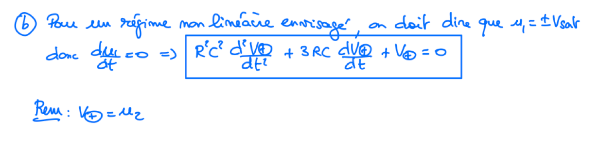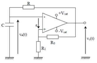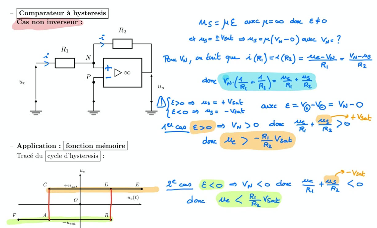 - connaître l’équation différentielle et la démonstration de la caractéristique d’un comparateur à hysteresis. Ci-dessous le cas d’un inverseur
