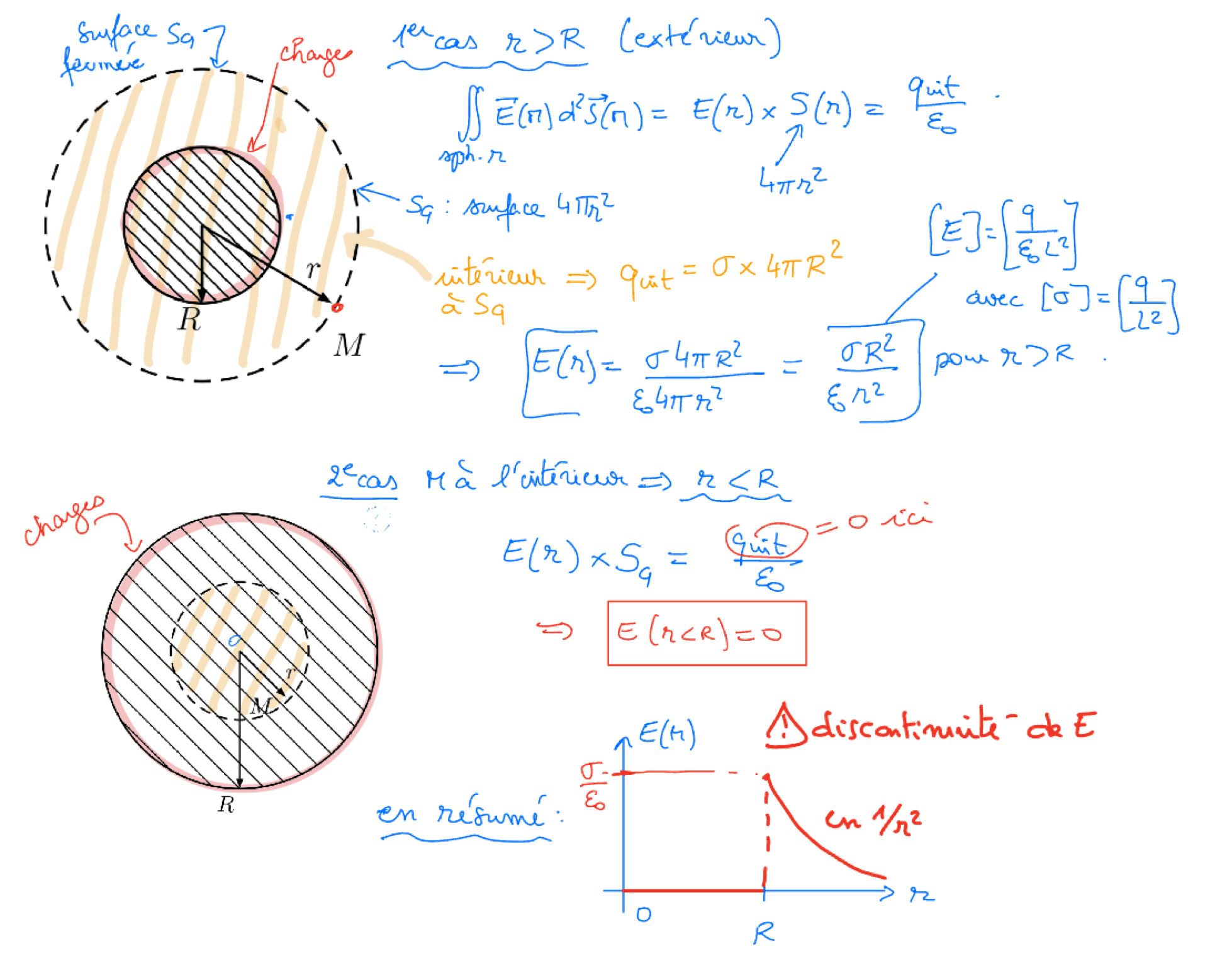 Cours de lundi : théorème de GAUSS pour la sphère chargée (surface ou volume)