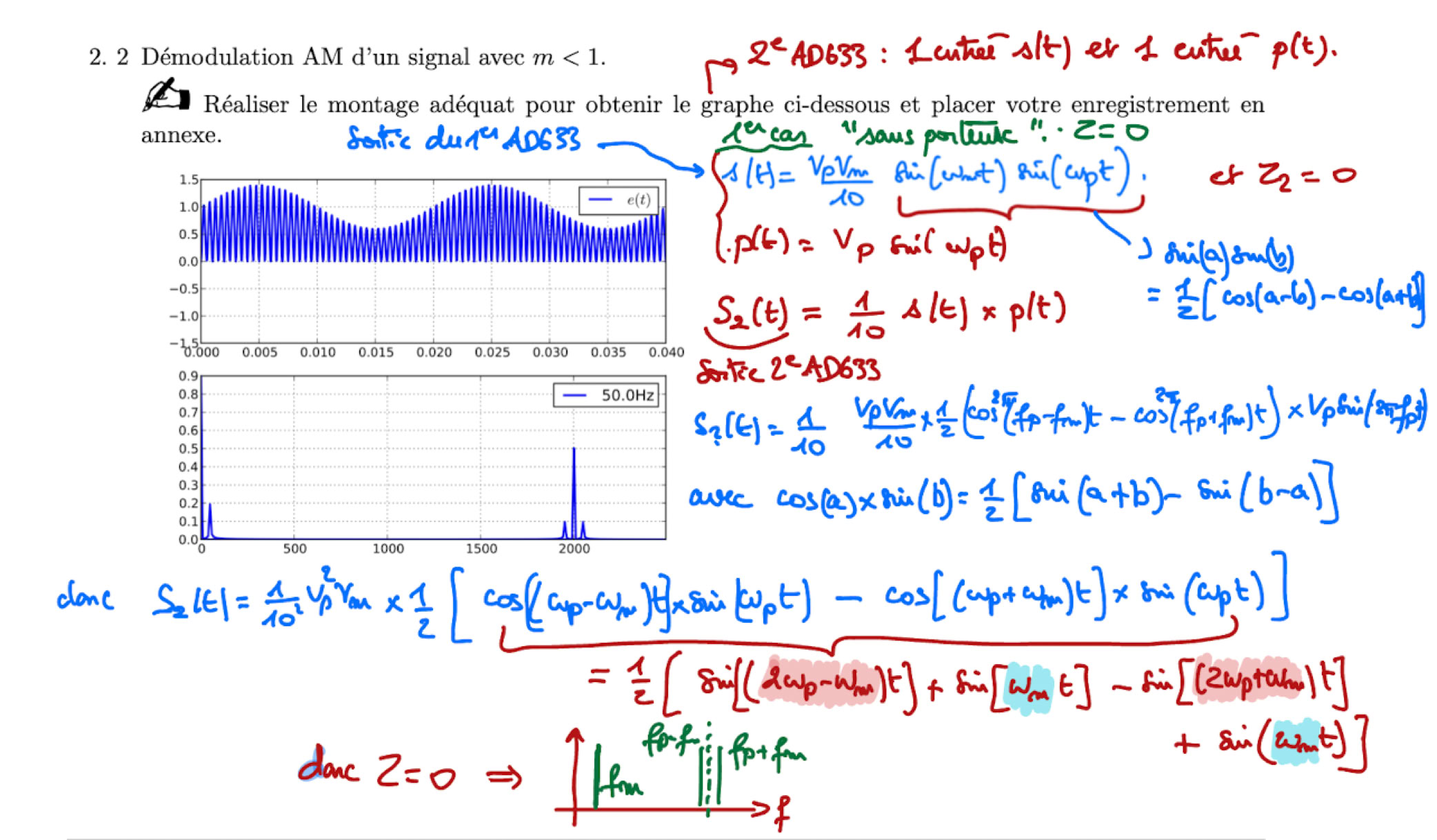 2 - démodulation d'un signal sinusoïdal modulé en amplitude "avec porteuse" : calcul du spectre du signal démodulé après avoir exprimé la composition du spectre du signal modulé initial. (poly 6 : 3-2, 2e cas)