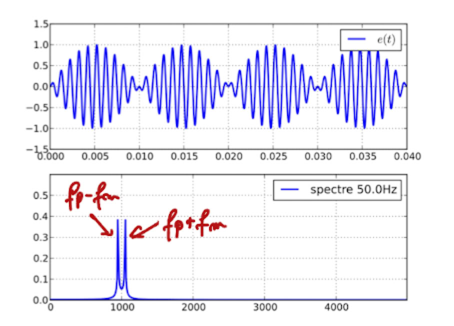 6 - modulation d'un signal sinusoïdal en amplitude "sans porteuse" : calcul du spectre du signal modulé (poly 6 : 1.4)