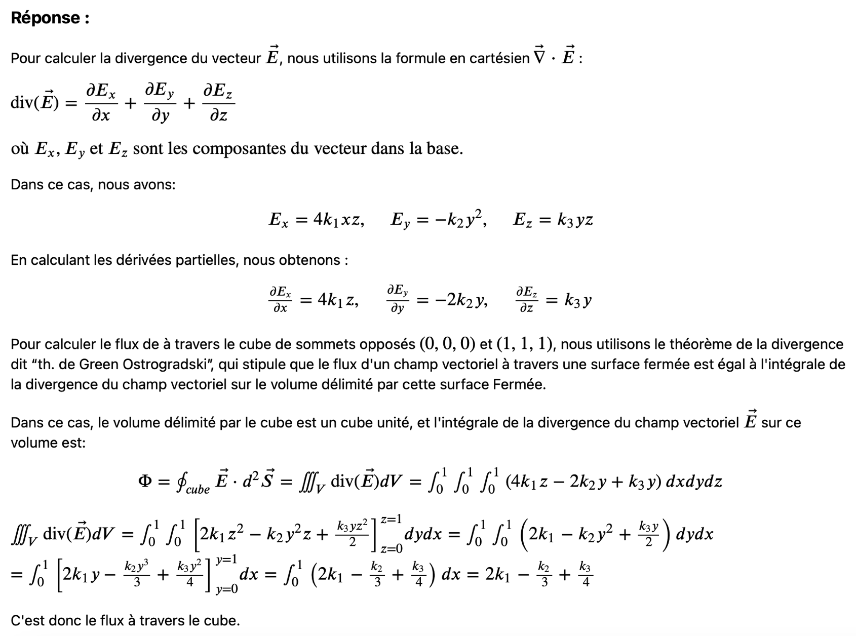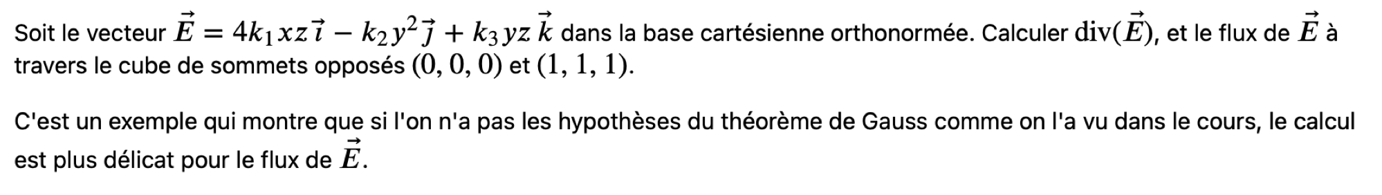 Il s’agit d’un exemple donné en colle. Cela montre la difficulté calculatoire de bien finir un calcul de flux lorsque l’on n’est pas dans le cas simple d’une surface de Gauss. Ici le champ E n’est pas uniforme sur les faces, à part sur 2 faces à y = cste, donc on ne peut le faire sortir du calcul intégral comme quand on applique le Th de Gauss, par exemple sur une sphère pour un champ radial.