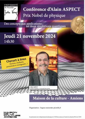 En cette période de remise de prix Nobel, je vous rappelle qu'une conférence de M. Alain ASPECT, Prix Nobel de Physique 2022 a eu lieu le 21 novembre 2024 à 14h30 à la Maison de la Culture à Amiens. Cet évènement était organisé par le département de physique de l'UFR des sciences de l'Université Picardie Jules Verne. L'entrée est libre, la durée estimée est de deux heures avec les questions. Le contenu porte sur la physique quantique et plus particulièrement sur l'intrication quantique, sujet pour lequel M. ASPECT a reçu le prix Nobel. La conférence est accessible à tous les publics. Rencontrer un chercheur de renommée internationale qui sait rendre accessible et compréhensible ses thématiques de recherche est une véritable chance pour les élèves de se voir présenter de façon rigoureuse et enthousiasmante les concepts de physique et leurs applications dans notre société. Vous trouverez plus d'informations sur le site disciplinaire : http://spc.ac-amiens.fr/976-conference-alain-aspect-prix-nobel-physique-chimie.html