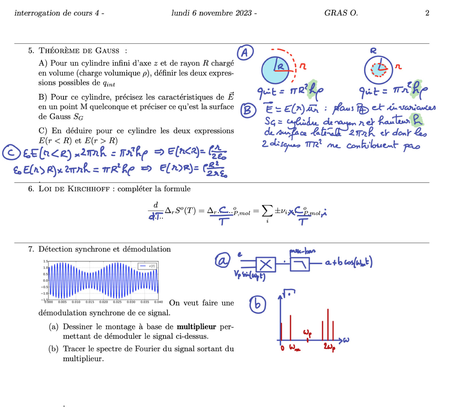 a) Modulation d'amplitude par utilisation d'un multiplieur, étude du spectre de Fourier associé, doublet et triplet, démodulation d'amplitude par utilisation d'un multiplieur (juste citer rapidement la détection asynchrone avec diode = détection de crêtes), conséquence sur le spectre de Fourier