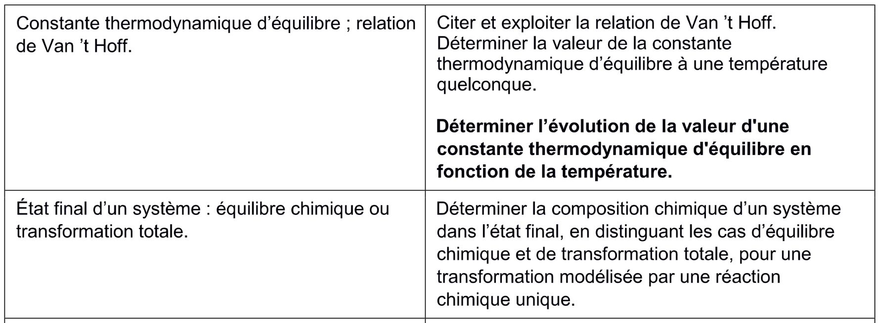 —chimie : identités thermodynamiques (dH, dG), expression de S en fonction de la dérivée de G par T, relation de Gibbs-Helmholtz, dG négatif démontré pour une réaction spontanée, potentiel chimique et enthalpie libre molaire, identité d’Euler, relation de Gibbs-Duhem, volume molaire et entropie molaire en fonction des dérivée du potentiel chimique, démonstration : la quantité d’une espèce diminue si son potentiel chimique est plus élevé + idem pour l’action de la pression ou le sens des échanges thermiques. Equilibre = égalité des potentiels chimiques