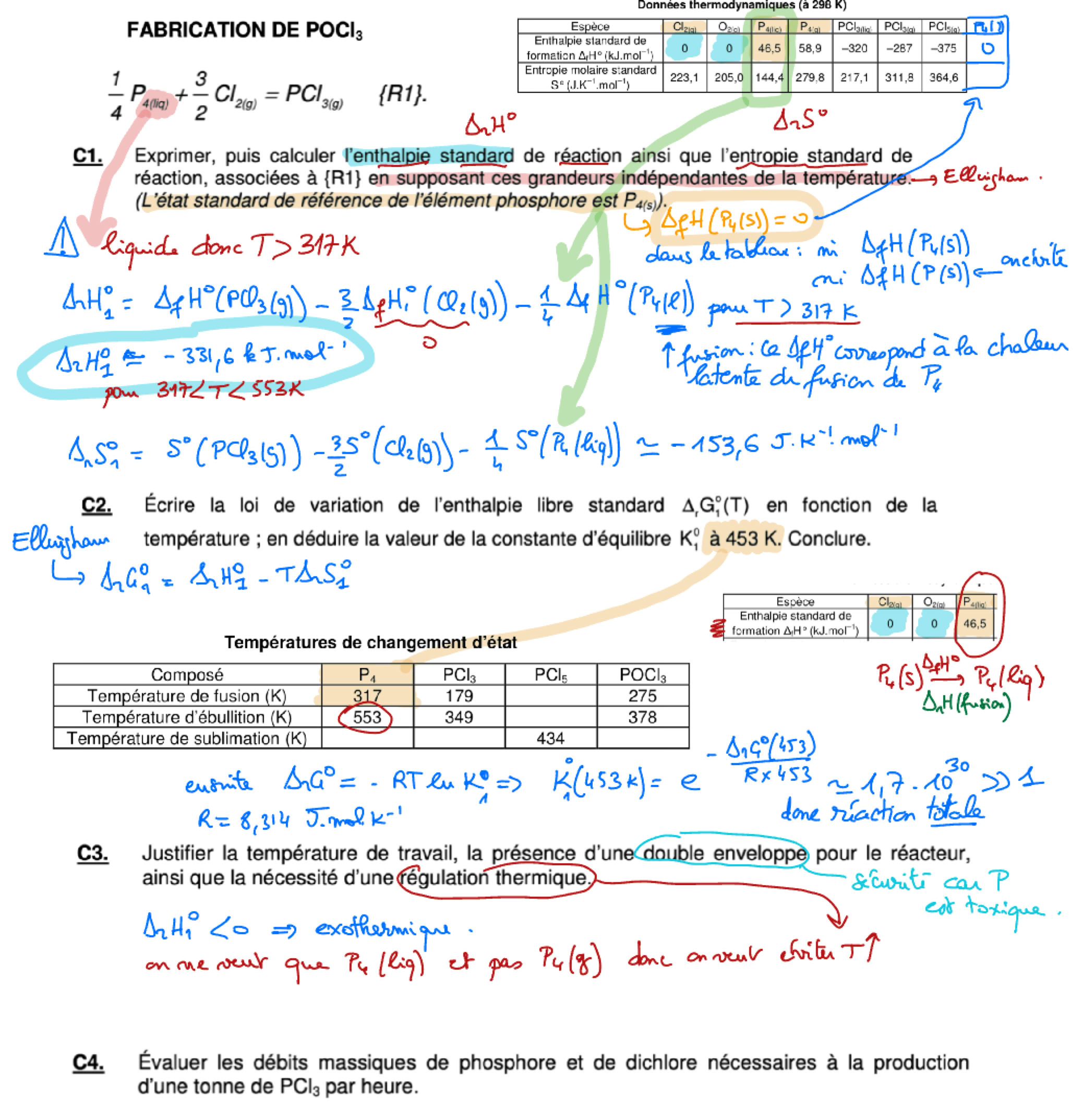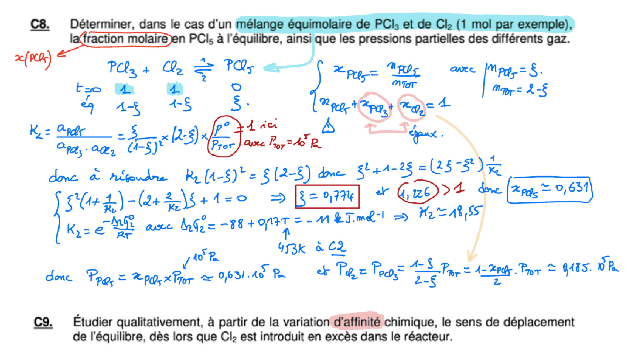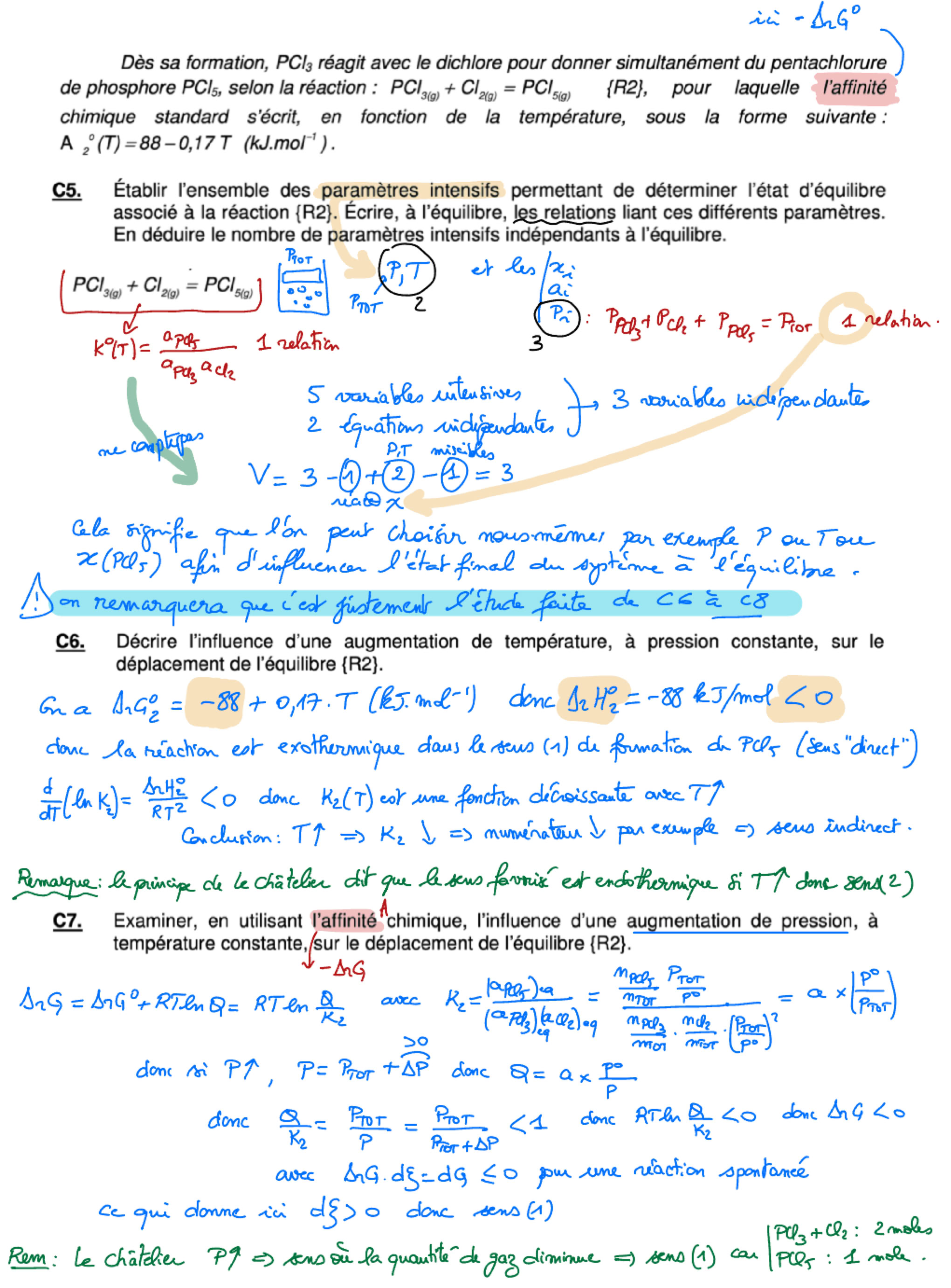 —chimie : identités thermodynamiques (dH, dG), expression de S en fonction de la dérivée de G par T, relation de Gibbs-Helmholtz, dG négatif démontré pour une réaction spontanée, potentiel chimique et enthalpie libre molaire, identité d’Euler, relation de Gibbs-Duhem, volume molaire et entropie molaire en fonction des dérivée du potentiel chimique, démonstration : la quantité d’une espèce diminue si son potentiel chimique est plus élevé + idem pour l’action de la pression ou le sens des échanges thermiques. Equilibre = égalité des potentiels chimiques + activité d’une espèce (gaz, liquide, solide, solvant) + enthalpie libre standard de réaction à l’équilibre.