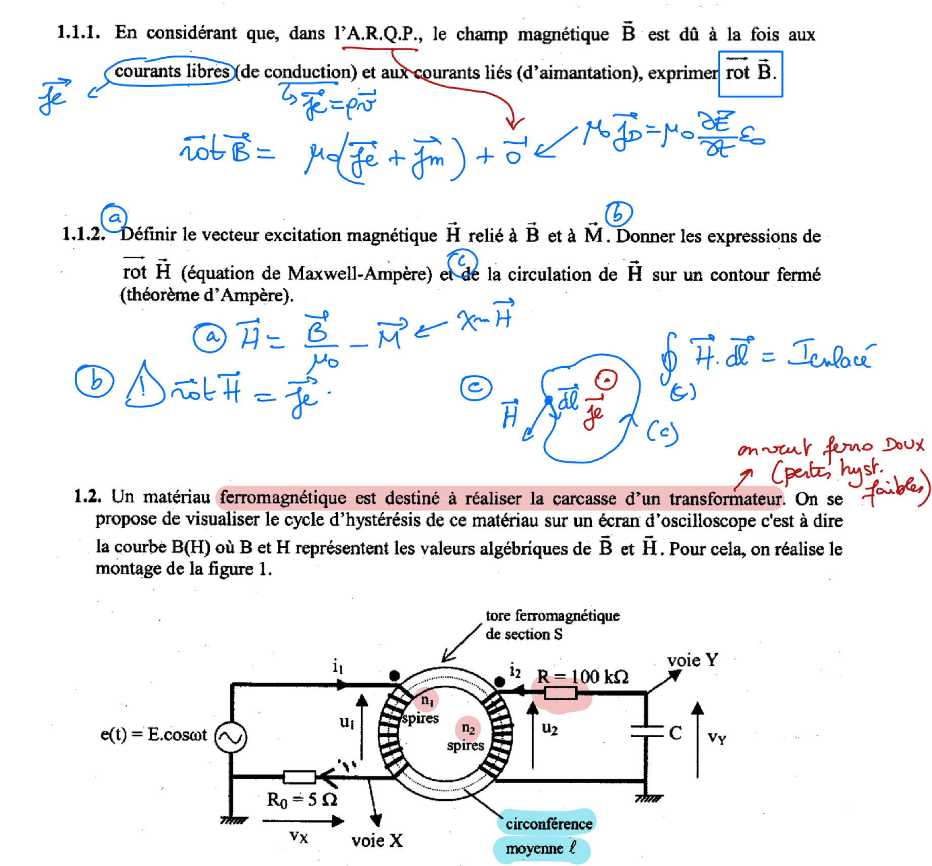 - milieu magnétique : cycle d’hysteresis + pertes par hysteresis, champ rémanent, champ coercitif, effet mémoire, définition de H et M + le cas idéal (cours et TP) du transformateur avec relations en tensions et courants + adaptation d’impédance.
