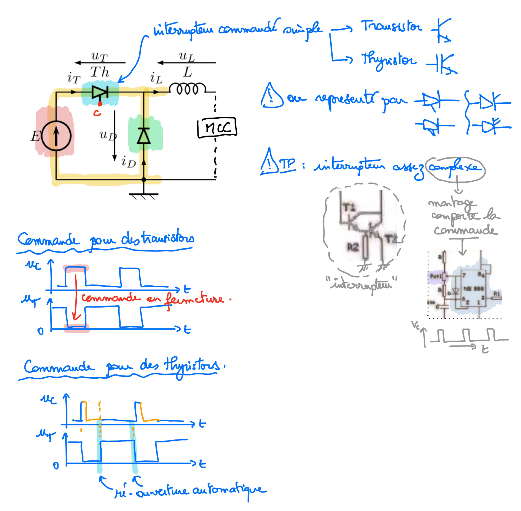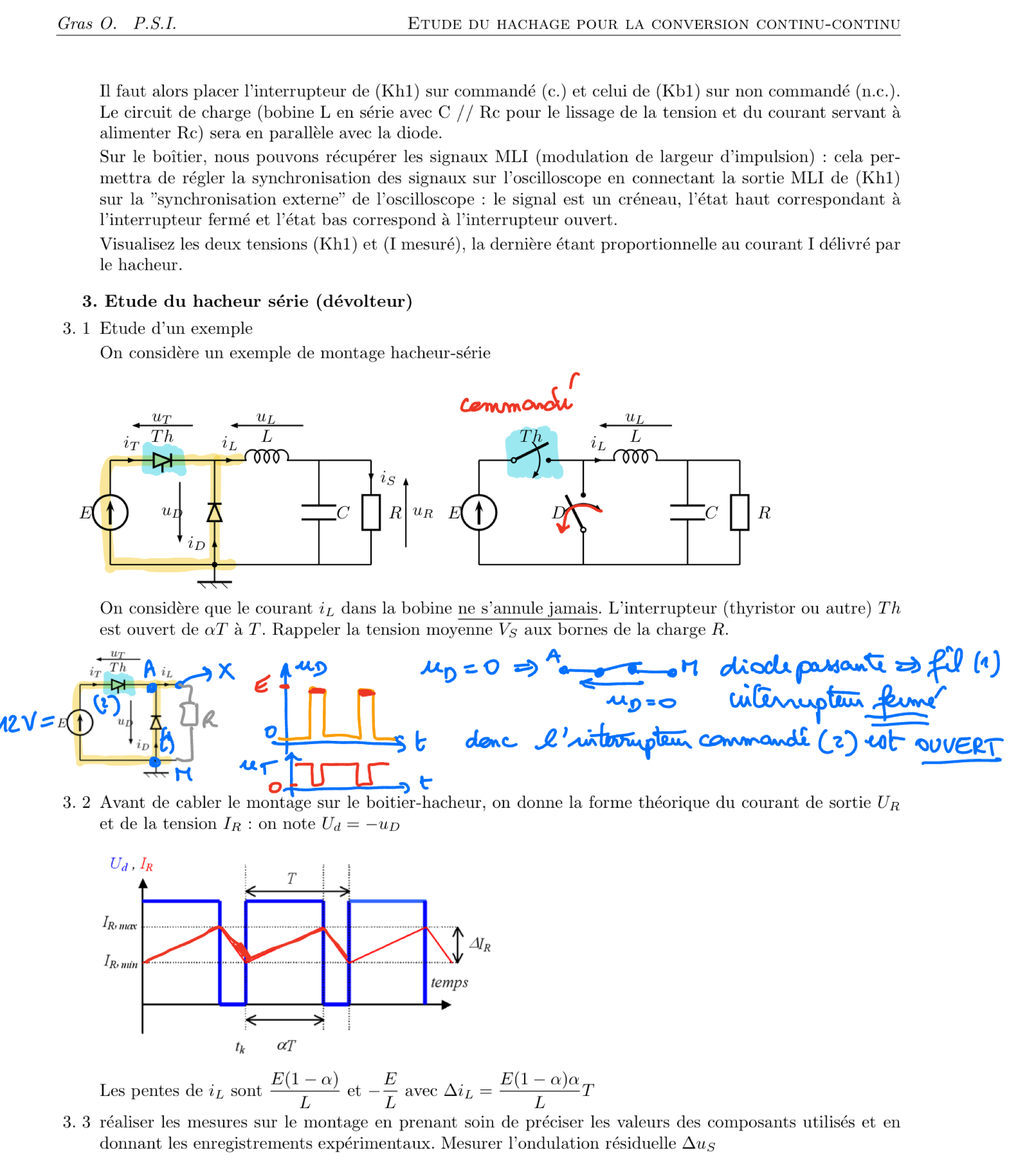 - A la rentrée : HACHEUR série (dévolteur) : cours et exemples sur le bloc de deux interrupteurs, lissage par une bobine, cas du courant i sans interruption, modèle à haute fréquence linéarisé, établissement du courant dans R et des pentes à partir des équations différentielles selon l’intervalle de temps (en fonction du taux de hachage \alpha), utilisation des pentes pour établir l’expression de la fluctuation de courant, utilisation de la tension moyenne nulle aux bornes de L pour démontrer l’expression de la tension moyenne aux bornes de R