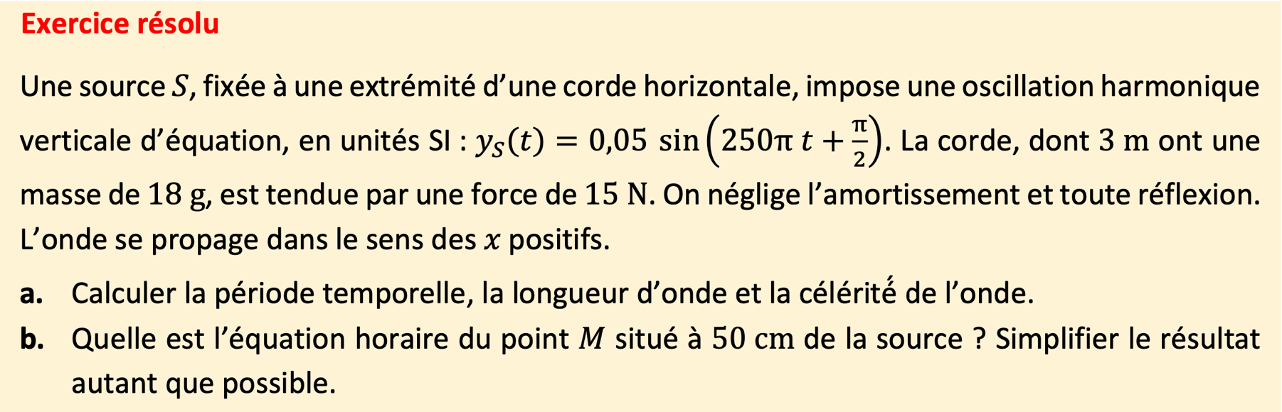 // pas encore : cas de la réflexion parfaite sur un point de fixation, déphasage à la réflexion, superposition d’une onde incidente et de l’onde réfléchie = onde stationnaire, cas des noeuds de vibration // pas encore la corde de Melde ni d’exemples de cordes de masse linéique non uniforme ni avec des masses attachées à la corde, ni le cas de deux points fixes//