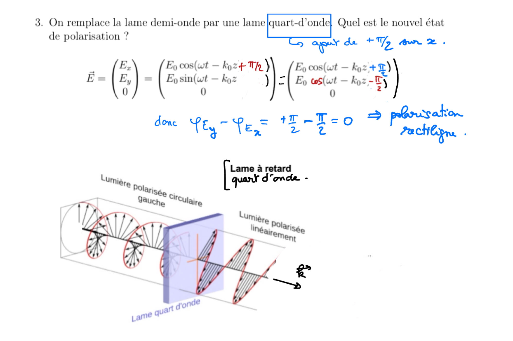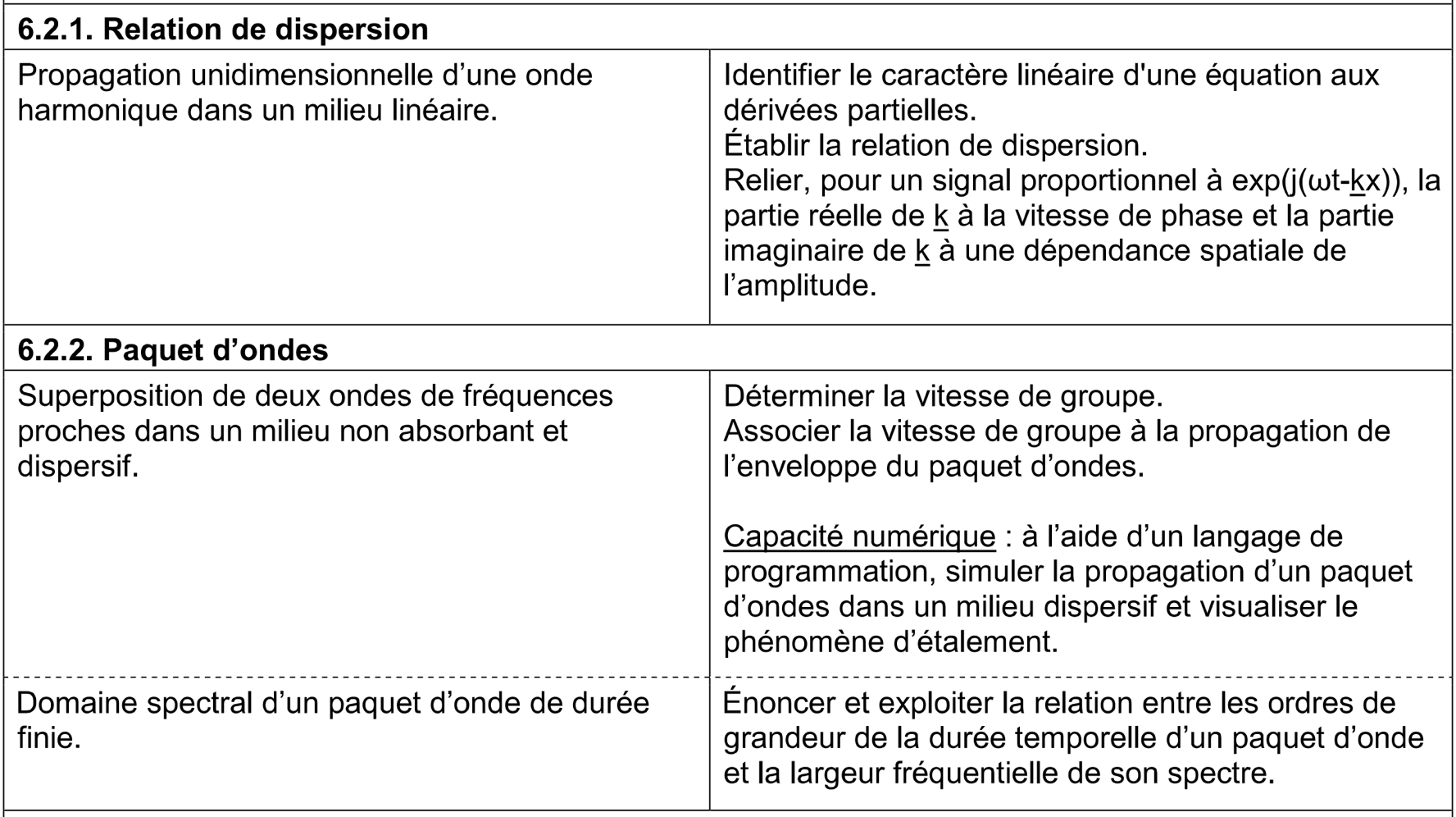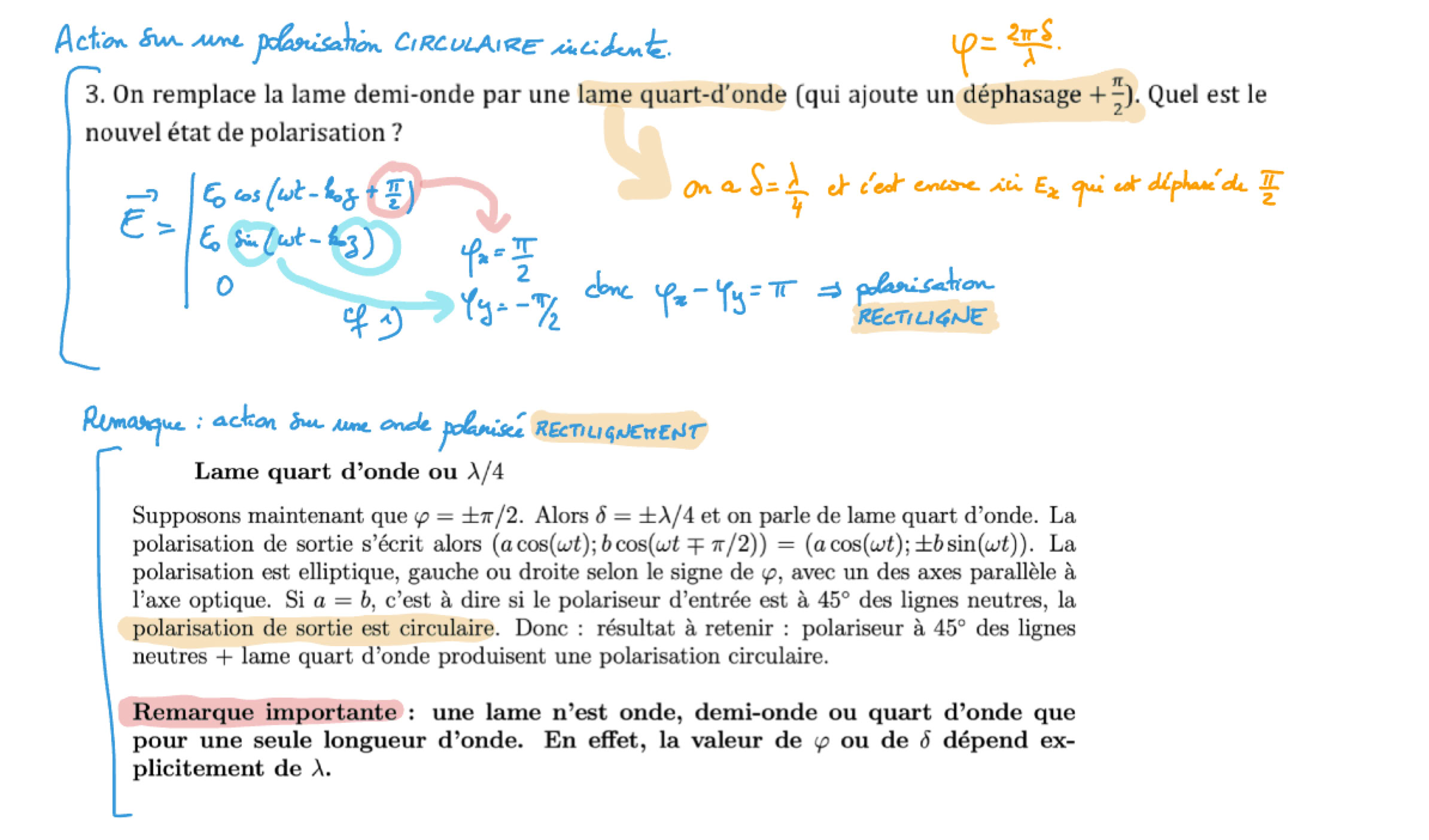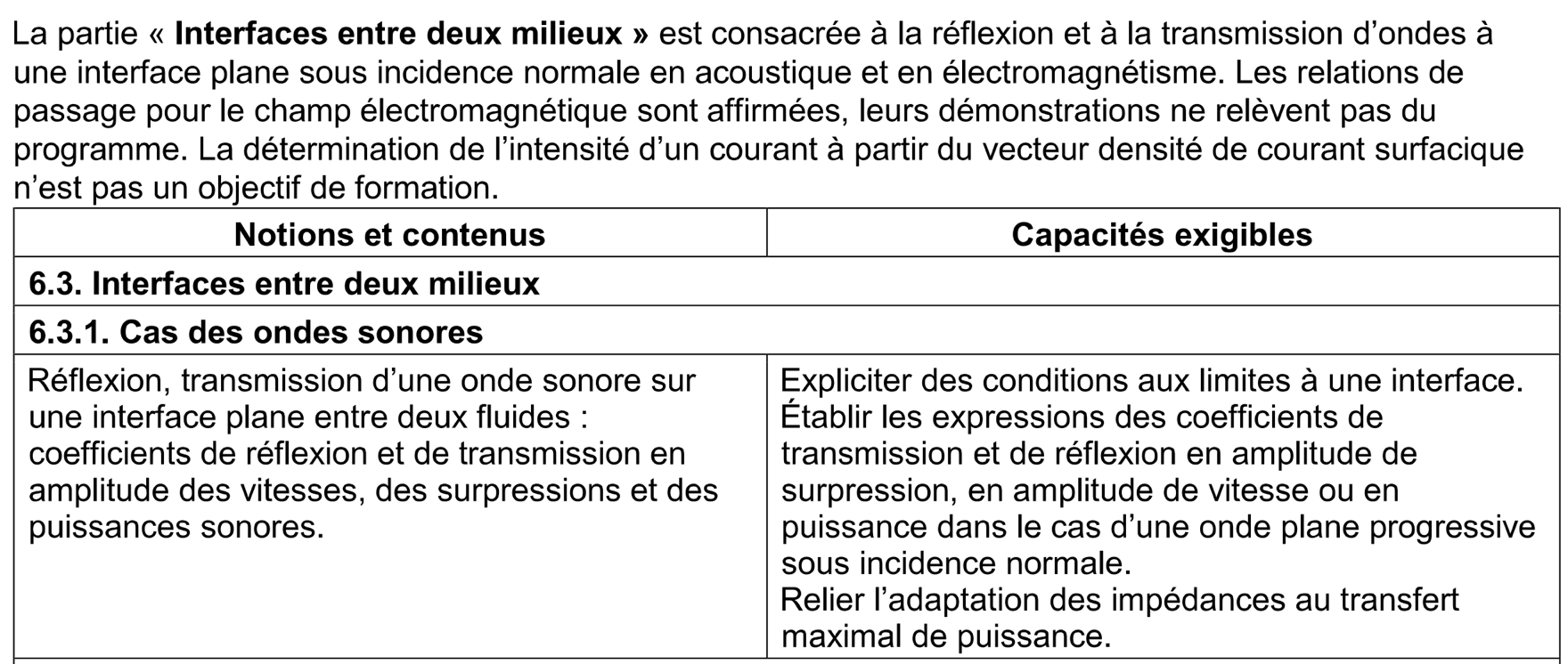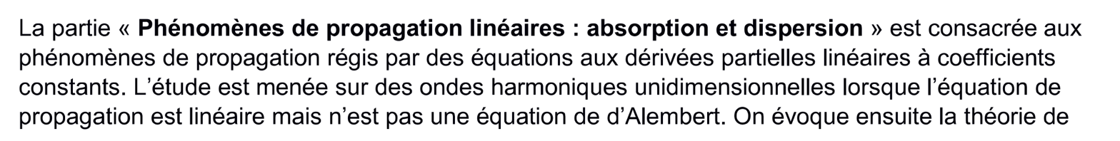- ondes mécaniques : cas de la corde tendue, établissement de l’équation de d’Alembert à partir du TCI sur un petit élément de corde (dans le cas d’un déplacement de faible amplitude), onde transversale, célérité, notation complexe pour l’onde, cas de la réflexion parfaite sur un point de fixation ou une perle ou une interface, déphasage à la réflexion, superposition d’une onde incidente et de l’onde réfléchie = onde stationnaire, cas des noeuds de vibration // corde de Melde (régime forcé) // masse attachée à la corde // cas de deux points fixes// Instruments à corde (révisions de 1ère année) //