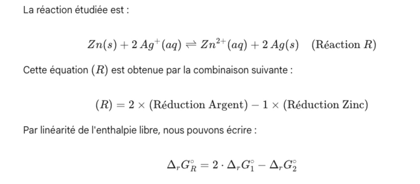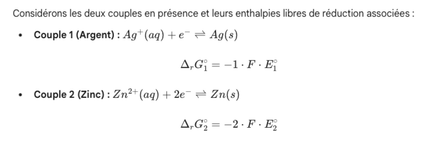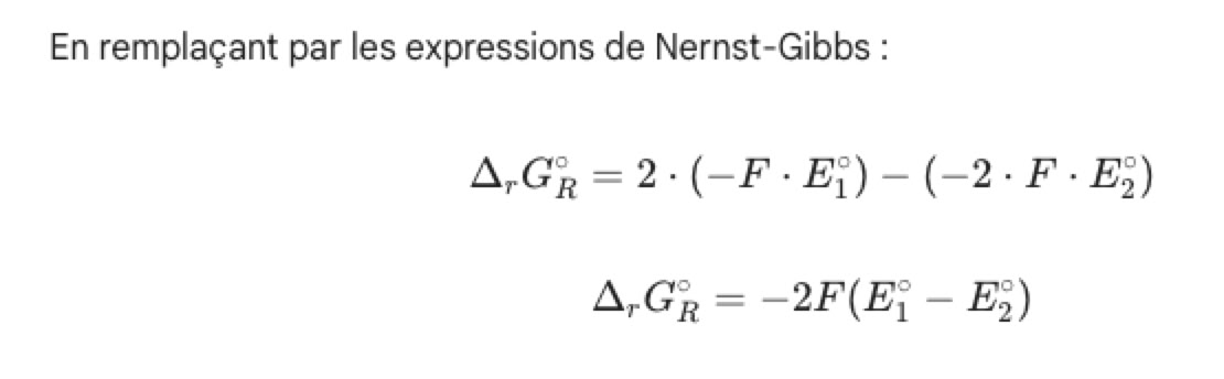 Ajout de la 2e année : enthalpie libre de réaction et sa relation avec -n.F.E, calcul de constante de réaction entre deux couples en fonction de la différence de potentiel standard