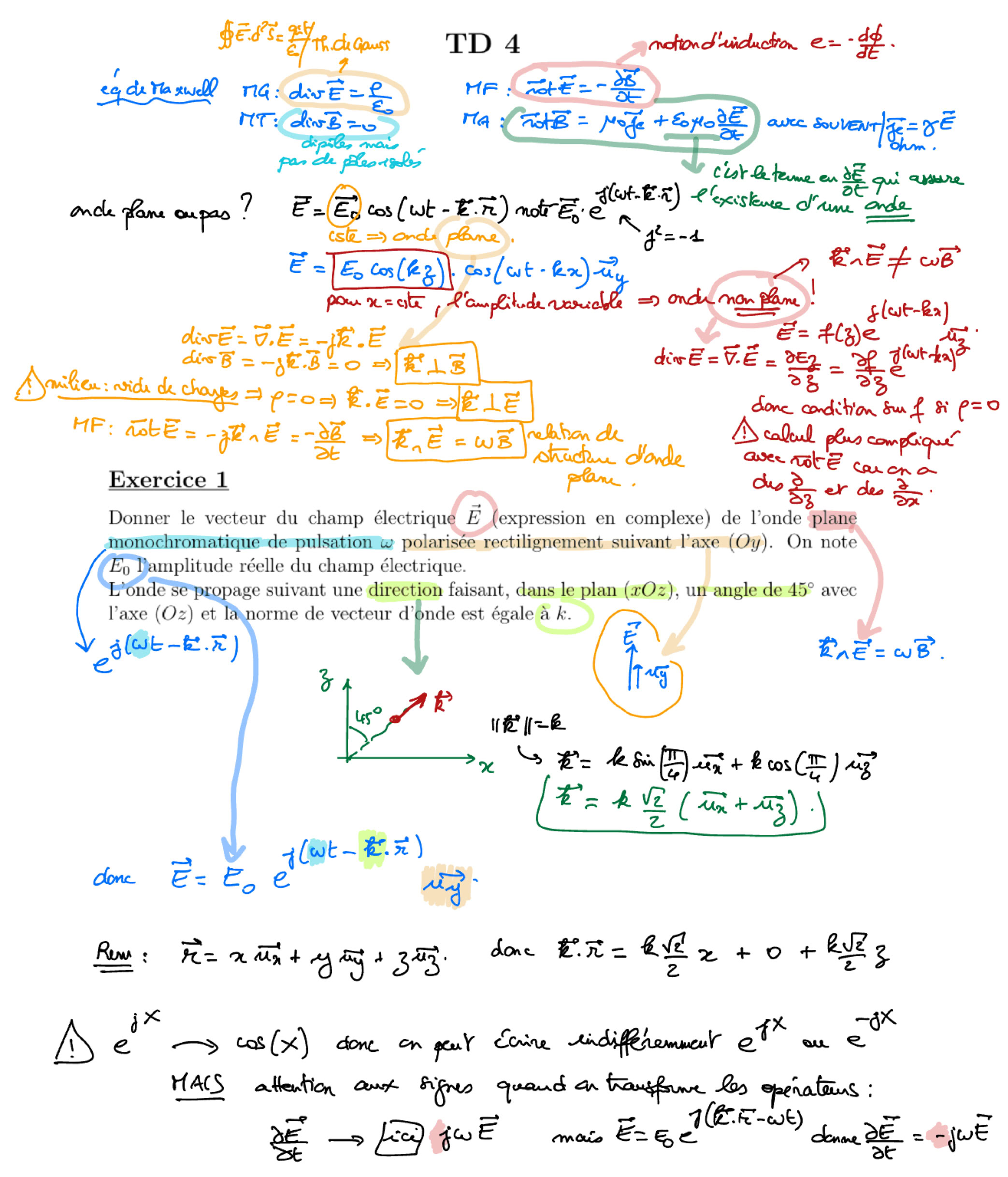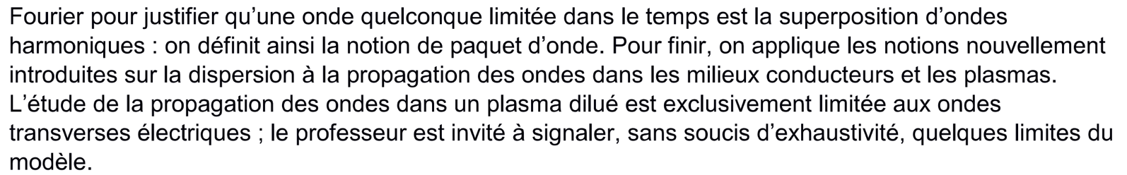 - ondes électriques sur un câble : cours ou exemple simple basé sur les équations électriques et les deux paramètres i(x,t) et u(x,t), notion d’équation de d’Alembert, impédance Z, u = +Z.i ou -Z.i en fonction du sens de propagation, (les cas de réflexion sur une impédance au bout du câble seront faits en TP ce mercredi)