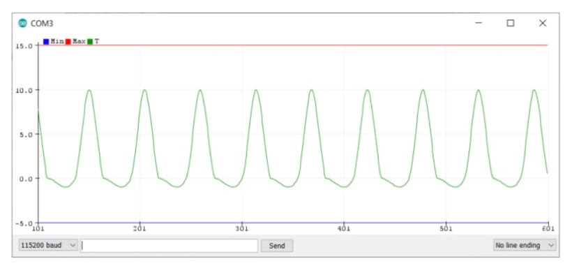 Programme C++ permettant de générer un sinus sur la borne de sortie analogique vraie A0, et de lire les données sur l’entrée analogique A1 avant de les tracer avec le «Traceur série» de l’IDE Arduino