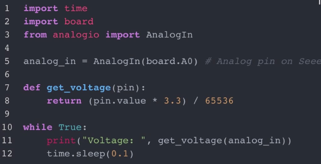 Programme MicroPython permettant de lire une donnée analogique en entrée sur la borneA0 (CAN supposé 16 bits donc 65536 valeurs sur un intervalle ici de 3,3V), et d’écrire les données sur la sortie série.