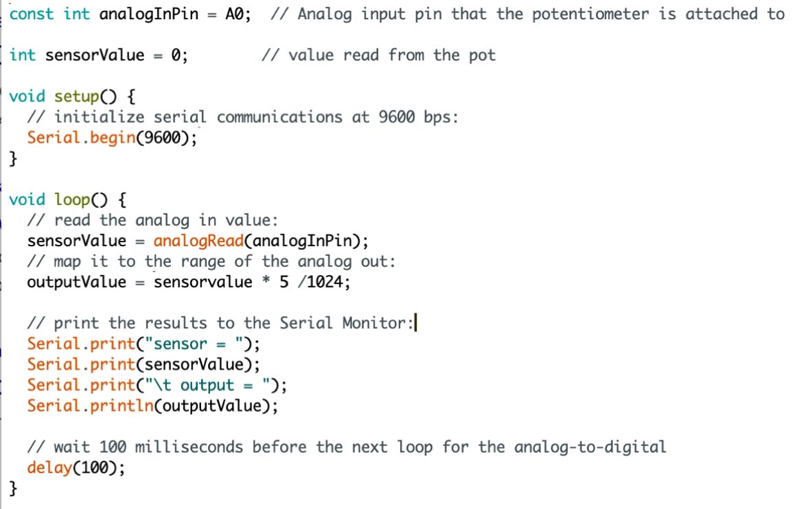 Programme C++ permettant de lire une donnée analogique en entrée sur la borneA0 (CAN supposé 10 bits donc 1024 valeurs, sur un intervalle ici de 5V), et d’écrire les données sur la sortie série.