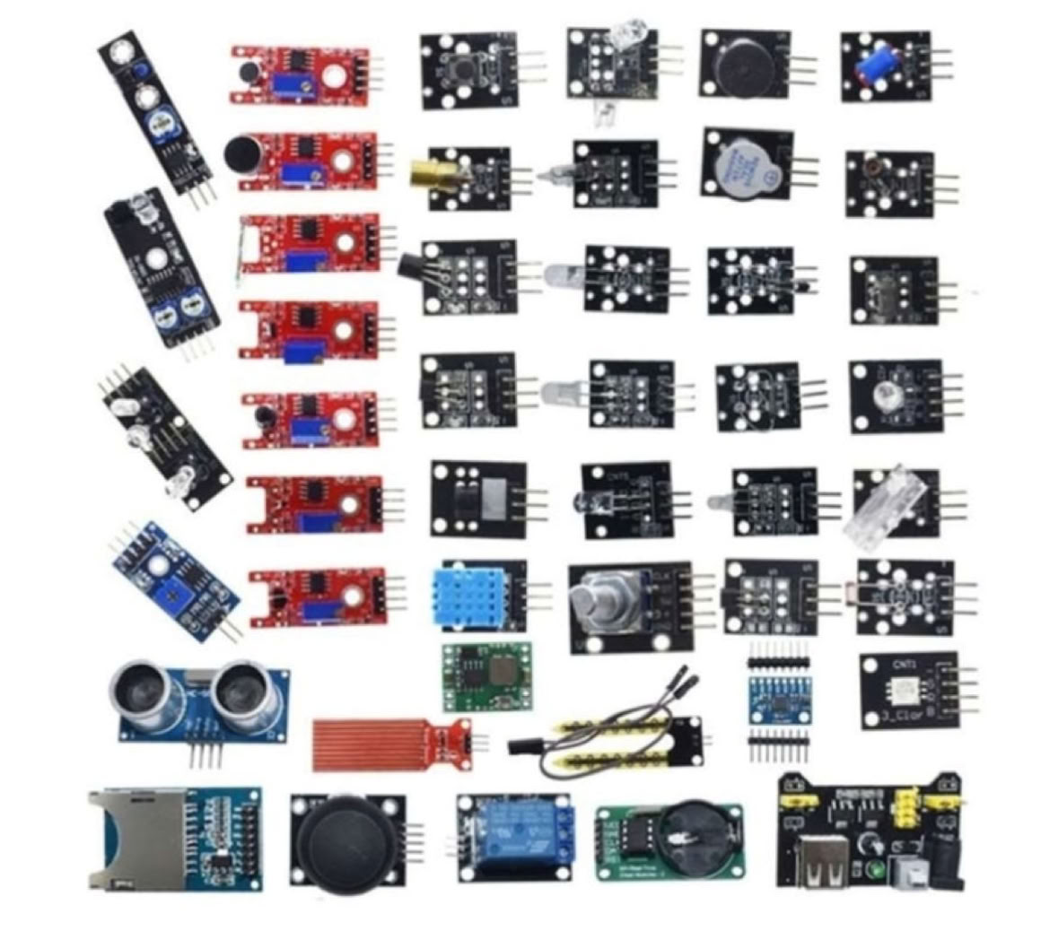 Sur la carte : LED + écran OLED + bouton poussoir + résistance variable + capteur de lumière + capteur sonore + DHT11 (température et humidité) + accéléromètre + pression atmosphérique